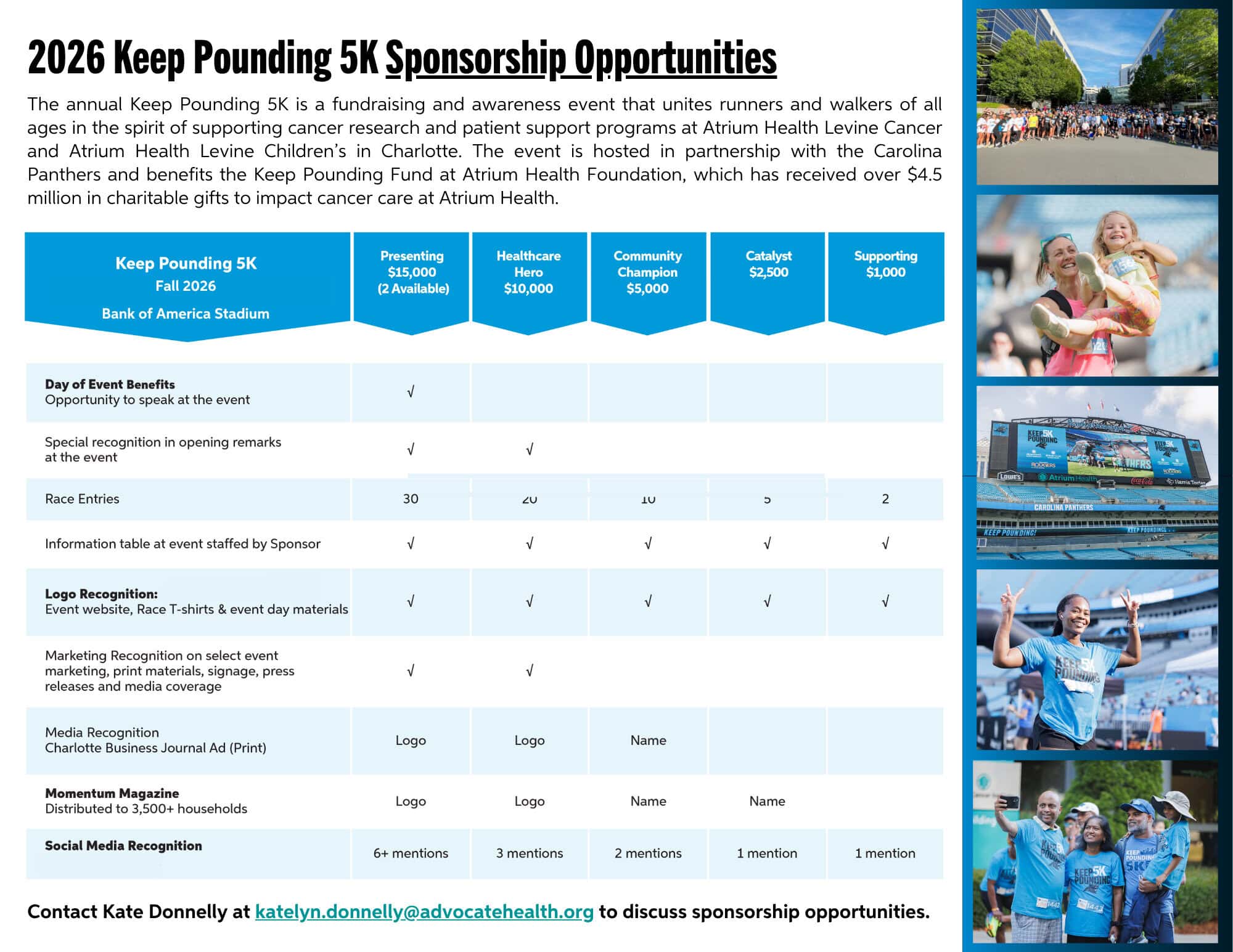 Join Atrium Health Foundation and the Carolina Panthers as a sponsor of the 16th Annual Keep Pounding 5K. Your support directly impacts cancer care, research, and patient support programs at Atrium Health Levine Cancer and Atrium Health Levine Children’s in Charlotte!
