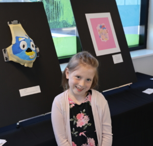 Charlotte, a cancer survivor, poses by her art at the 2025 artist showcase.