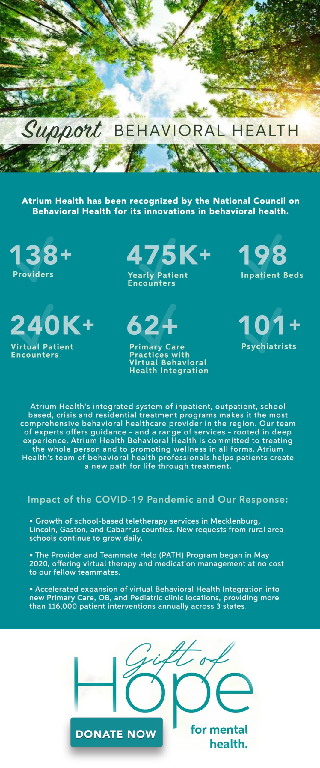 Philanthropic support is vital to Atrium Health’s efforts to develop new resources, improve mental health intervention, and expand our virtual and integrative programs.