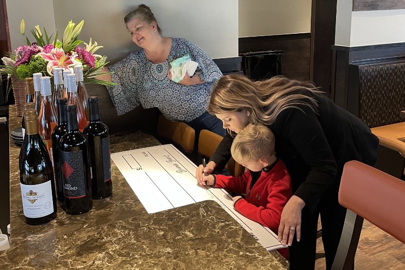 Pictured above: Outback Steakhouse employees and family members of former Levine Children’s patient, Jameson, recently gathered to present a check for $5,000 to Atrium Health Foundation on behalf of Levine Children’s. Pictured left: Managing partner Kaylana helped her son, Jameson, sign the check for Levine Children’s.