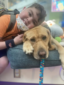 As a facility dog, Sprout serves as a core member of the treatment team, working in tandem with physicians, nurses, and Child Life specialists to help patients achieve their clinical goals. On the inpatient rehabilitation unit, this often means motivating patients to complete their physical therapy exercises. In the Torrey Hemby Center for Cancer & Blood Disorders, he leads programs like “Arts & Barks” to bring comfort to children going through treatment. Sprout is the first dog to work directly with cancer patients at Levine Children’s – a milestone made possible by the Dogs for Joy™ grant, which helped purchase proper sanitization materials to keep kids in the clinic safe.