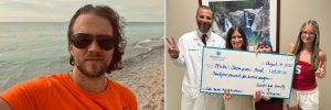 Left: On a family outing at Sleeping Bear Dunes, Mike was determined to reach Lake Michigan—despite steep dunes, tired kids, and little water—exemplifying the perseverance he brought to every challenge in life. Right: After hosting a successful fundraiser, Michelle and two of her children, Sophie and Dylan, joined Mike’s oncologist, Dr. Mohamed Salem, to celebrate raising over $22,000 for Levine Cancer in Charlotte.